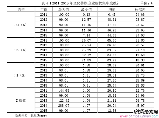 從表 4-1 的統(tǒng)計(jì)結(jié)果來看,所統(tǒng)計(jì)的 44 家文化傳媒企業(yè)的 CR1 在從 2011 年到 2015 年的最大值幾乎無變化,但可以看出由以前 100%控股的局面向分散型股權(quán)轉(zhuǎn)變,但不明顯,其次其最小值在 2012 年獲得大幅增加后開始不斷遞減,而總體均值也在 2012 年的大幅增加后出現(xiàn)遞減。而 CR5 的最大值幾乎無變化,最小值在 2012 年和 2013 年遞減后,于 2014 年出現(xiàn)大幅度增長(zhǎng).其均值總體來看也呈下降趨勢(shì)。對(duì)于 H 指數(shù)來說,本文選取的是第一大股東的數(shù)據(jù)即 H1,其目的就是為了表示第一大股東持股的離散程度,可以看出其最大值在 2012 年下降到98.01%以后,就沒有變化過,而其最小值在五年內(nèi)也出現(xiàn)了小幅度的減少,總體均值來看呈下降趨勢(shì)。Z 指數(shù)是反映了股權(quán)的制衡程度越大說明其股權(quán)越集中,第一大股東對(duì)其他人的制衡程度就越高,從表內(nèi)數(shù)據(jù)反映出,Z 指數(shù)的總體變化都趨于下降??偠灾?,觀察我國(guó) 44 家文化傳媒企業(yè)的股權(quán)集中程度的相關(guān)指標(biāo)發(fā)現(xiàn),2011 年到 2015 年間我國(guó)文化傳媒上市企業(yè)的股權(quán)集中度下降。