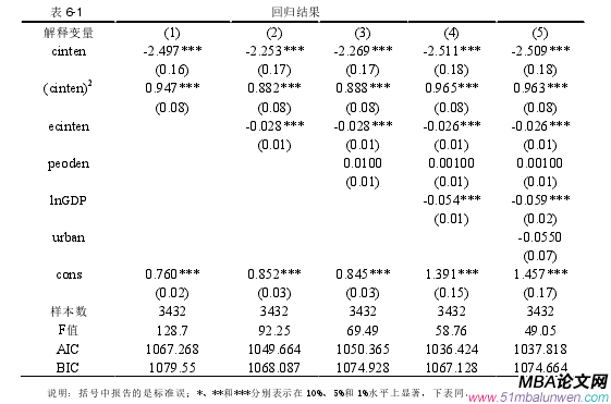 6.3 城市化水平。文獻(xiàn)研究表明,城市和農(nóng)村居民的能源消費水平存在很大差距,城市居民的人均能源消費量高于農(nóng)村居民的約 3.5-4 倍(何曉萍,2009),因此城市居民會產(chǎn)生更多的碳排放,林美順(2016)研究認(rèn)為,城市化率每上升 1%,會導(dǎo)致碳排放強度增加 0.247%。但另一方面,相對于農(nóng)村地區(qū)來說,城市的技術(shù)水平也較高,因此能源利用率也要高于農(nóng)村地區(qū)。所以城市化水平對碳排放及減排成本的影響是不確定的(Du,2012)。本文采用各城市非農(nóng)業(yè)人口占城市總?cè)丝诘谋戎貋砗饬俊?br />