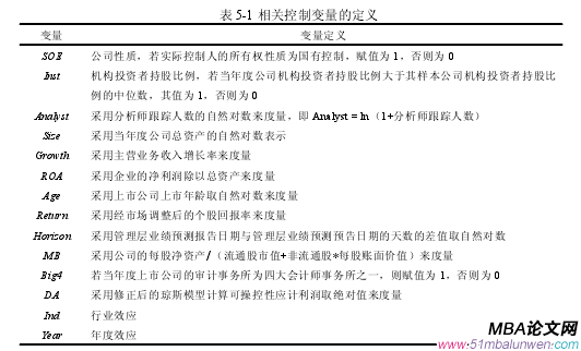 本文所選取的數(shù)據(jù)年限間隔是從 2006 年至 2014 年,所選取的樣本來自于上海和深圳兩市的主板上市公司(不含創(chuàng)業(yè)板)。論文所用主要變量管理層業(yè)績預(yù)測數(shù)據(jù)來自萬德數(shù)據(jù)庫,內(nèi)部人交易數(shù)據(jù)手工收集于滬深證券交易所網(wǎng)站,企業(yè)的財務(wù)數(shù)據(jù)與股權(quán)性質(zhì)數(shù)據(jù)均來自國泰安數(shù)據(jù)庫。其中由于內(nèi)部人交易可能來源于二級市場買賣(競價交易)、分紅送轉(zhuǎn)、股權(quán)激勵實施、可轉(zhuǎn)債轉(zhuǎn)股等形式,但是只有二級市場買賣(競價交易)這一形式能夠體現(xiàn)管理層的個人意志。因此,本文的內(nèi)部人交易數(shù)據(jù)僅保留二級市場買賣的內(nèi)部人交易。我們對論文的樣本執(zhí)行下列數(shù)據(jù)篩選過程:(1)剔除金融、保險行業(yè)上市公司,因為金融、保險行業(yè)具有其行業(yè)的特殊性;(2)剔除上市年限不足一年的上市公司,因為模型回歸中需要采用上年度的財務(wù)數(shù)據(jù);(3)剔除財務(wù)數(shù)據(jù)缺失的樣本。在進行上述篩選過程后,本文共得到 5161 個樣本數(shù)據(jù)。本文主要使用統(tǒng)計分析軟件 Stata12.0 對相關(guān)數(shù)據(jù)進行處理,并對其進行后續(xù)的計量分析。另外,為排除異常值的影響,對所有的連續(xù)變量進行了(1%,99%)的 winsorized 處理。