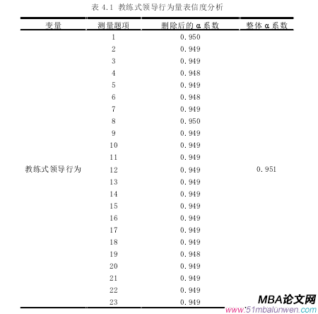為保證論文的嚴(yán)謹(jǐn),在對(duì)數(shù)據(jù)進(jìn)行回歸分析之前,對(duì)量表測(cè)得的數(shù)據(jù)進(jìn)行信度與效度的檢驗(yàn),下面分別對(duì)教練式領(lǐng)導(dǎo)行為、情感承諾、員工工作倦怠進(jìn)行信效度的測(cè)量。效度是指是否正確的測(cè)量得到了想要測(cè)量的概念,包含內(nèi)容效度和構(gòu)念效度。內(nèi)容效度指題目的設(shè)定是否有代表性,對(duì)實(shí)際情況的測(cè)量效果;構(gòu)念效度指獲取的結(jié)果與量表的理論設(shè)計(jì)是否契合。本文的量表均是成熟量表,在國(guó)內(nèi)外的實(shí)證研究中均有使用,可以表現(xiàn)出合理的內(nèi)容效度。本文采用探索性因子分析的方法來(lái)測(cè)量構(gòu)念效度,結(jié)合 KMO 指和 Bartlett 球形檢驗(yàn)以及總變量解釋率來(lái)進(jìn)行效度分析。