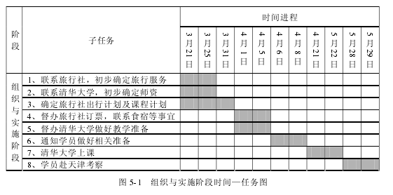 南寧市C局于2012年5月下旬組織一次省外培訓,培訓計劃的主題擬定為“領導能力提升”,在2011年9月呈報培訓計劃,2011年12月計劃獲批,確定培訓實施機構為清華大學。2012年3月初,培訓實施工作開展,首先對整個培訓項目進行了培訓工作的周密策劃,工作的每個環(huán)節(jié)如何開展,時間安排,注意事項以及目標達成等在策劃書中有明確體現,如:培訓組織與實施階段的時間—任務進程如下圖5-1所示:在訪談后對本次培訓的參訓干部的基本情況,對培訓的基本需求有了初步的了解,于3月中旬設計調查問卷,進一步掌握參訓干部的培訓需求(問卷設計見附錄)。問卷發(fā)放40份,回收28份,為有效樣本數量,對問卷調查結果進行了認真分析,并撰寫調研報告,報告中對問題的分析準確、全面,部分題目的分析樣式如下:問題:您領導與管理的工作中,遇到的突出問題有哪些?南寧市城管部分報送的培訓需求調研報告審核通過后,經過一番比較和詢價,最終選擇了南寧市Q旅行社作為這次培訓的服務機構。培訓于2011年5月下旬如期舉行,在培訓過程中,對培訓課程也有詳細的評價,并在本單位的網站上發(fā)布了培訓的相關報道。在整個培訓過程中,培訓管理非常到位,培訓服務的各項工作均有具體安排,以人員組織分工為例,培訓項目負責小組列出詳細的分工明細.