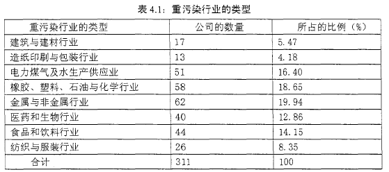 根據(jù)以上的分類(lèi)和蹄選程序,最終選取了 311家上市公司作為研究樣本,并認(rèn)真查閱了其年度財(cái)務(wù)報(bào)告。行業(yè)類(lèi)型的具體情況如表4.1所示。