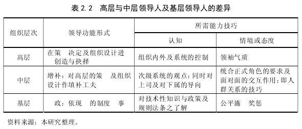 領(lǐng)導(dǎo)者(leader)一詞,早在一千三百多年以前就出現(xiàn)(Bass,1985),而領(lǐng)導(dǎo)者依其所處的地位層級(jí),區(qū)分為高階主管、中層主管、基層主管(張志育,1998)。至于各階主管所應(yīng)具備的管理技能,Katz(1955)認(rèn)為優(yōu)秀的管理者應(yīng)具有技術(shù)性技能、人際關(guān)系技能,以及概念化技能等三種管理技能。而此三種技能的重要性,又因主管階層的任務(wù)與性質(zhì)而有所不同。