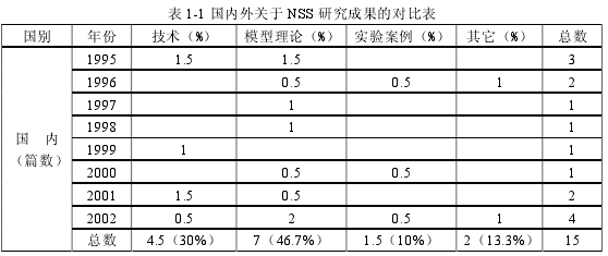 表 1-1是 1995 年到 2002 年國內(nèi)外關(guān)于NSS研究成果的對比表,客觀反映了NSS的研究現(xiàn)狀及發(fā)展方向。