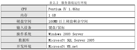 本系統(tǒng)是以 Windows 系統(tǒng)為操作平臺(tái),用 VB.net 編程語(yǔ)言做網(wǎng)頁(yè)界面,同時(shí)用腳本語(yǔ)言做網(wǎng)頁(yè)界面與底層數(shù)據(jù)庫(kù)的互聯(lián),用 SQL Server 數(shù)據(jù)庫(kù)來(lái)實(shí)現(xiàn)高等職業(yè)衛(wèi)生學(xué)校學(xué)生宿舍管理系統(tǒng)所需功能的。同時(shí),在系統(tǒng)的開發(fā)中,我們充分考慮到有些高等職業(yè)衛(wèi)生學(xué)校由于在終端資金的投入等諸多因素,因此在硬件要求上不做苛刻要求,具體運(yùn)行環(huán)境見(jiàn)表 2.1 及2.2。