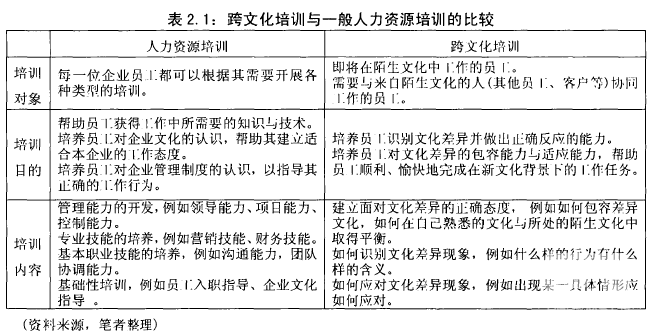 一般意義上人力資源的培訓(xùn)與跨文化培訓(xùn)是不同的。它們即有共性也有差異,在培訓(xùn)內(nèi)容與目的方面,一般人力資源培訓(xùn)主要是如何讓員工具備符合工作所需的條件,跨文化培訓(xùn)因?yàn)橐?ldquo;文化”作為培訓(xùn)的出發(fā)點(diǎn),所以受訓(xùn)者不僅能在工作中應(yīng)用培訓(xùn)成果,而且在日常生活中也能有幫助??缥幕嘤?xùn)的對(duì)象則是一般人力資源培訓(xùn)適用對(duì)象的一個(gè)子集。現(xiàn)對(duì)兩者的比較總結(jié)如表2.1。