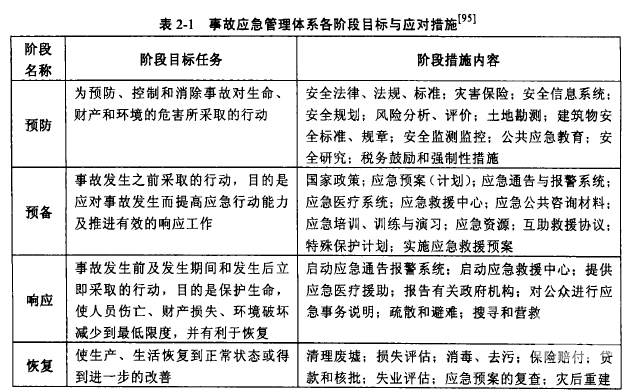 事故是指由于物質(zhì)(或自然)的不安全狀態(tài)和人的不安全行為而發(fā)生,并導(dǎo)致人員死亡、傷害、疾病或財產(chǎn)損失的偶然、突發(fā)性事件。絕大多數(shù)傷亡事故是可以預(yù)防的,預(yù)防效果比應(yīng)急救援效果更好,應(yīng)加強(qiáng)事故預(yù)防工作,防止緊急事件或事故發(fā)生,以減少應(yīng)急行動。事故預(yù)防首先要求建立完善的安全法規(guī)、標(biāo)準(zhǔn)和防災(zāi)政策體系;其次,應(yīng)做好危險辨識、風(fēng)險分析評估、監(jiān)測監(jiān)控、安全檢查與隱患整治等工作。雖然事故可以預(yù)防,但在一定技術(shù)與管理條件下,還可能有事故發(fā)生,因此必須為事故應(yīng)急救援做好應(yīng)急計劃與準(zhǔn)備,包括應(yīng)急救援系統(tǒng)的建立、應(yīng)急預(yù)案的編制等。一旦事故發(fā)生,根據(jù)應(yīng)急預(yù)案的響應(yīng)程序和內(nèi)容要求啟動應(yīng)急救援系統(tǒng)。應(yīng)急響應(yīng)就是出現(xiàn)緊急事件時為控制或減輕事件后果而采取的緊急行動,包括應(yīng)急通告報警、應(yīng)急救援、應(yīng)急疏散等。應(yīng)急響應(yīng)是一個過程,具體響應(yīng)級別標(biāo)準(zhǔn)、響應(yīng)程序、響應(yīng)人員、應(yīng)急處置措施等應(yīng)按應(yīng)急預(yù)案要求確定。應(yīng)急響應(yīng)之后需進(jìn)行現(xiàn)場清理,使生產(chǎn)系統(tǒng)恢復(fù)正常狀態(tài),并對事故情況進(jìn)行評估。這樣就形成完整的應(yīng)急管理循環(huán)。當(dāng)然,在實際應(yīng)急管理中,這4個階段(要素)有時是重疊的,并不一定絕對獨(dú)立。