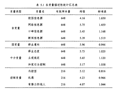 本部分將對(duì)高校畢業(yè)生擇業(yè)信息源對(duì)擇業(yè)意向的影響機(jī)制中的各個(gè)變量進(jìn)行描述性統(tǒng)計(jì)分析,具體的有效樣本量、均值和標(biāo)準(zhǔn)差匯總在下表中。從表5.1中可以看到,自變量、因變量和中介變量的有效樣本量為648個(gè),而控制變量的有效樣本量為216個(gè),這是因?yàn)閷?duì)于216個(gè)有效被試中,每個(gè)被試都填寫(xiě)了三個(gè)公司對(duì)于本研究自變量、因變量和中介變量的情況。在后期實(shí)際相關(guān)和回歸分析中采用多層線性模型時(shí),仍然根據(jù)216個(gè)有效樣本量進(jìn)行分析,只是所有的648個(gè)數(shù)據(jù)匯總于多層線性模型的Level 1,而216個(gè)數(shù)據(jù)匯總于多層線性模型的Level 2。從均值上看,校園信息源的均值略低,而網(wǎng)絡(luò)、口碑和新聞信息源的均值均高于5。說(shuō)明被試所選的三個(gè)企業(yè)在校園活躍度上總體表現(xiàn)一般,而在網(wǎng)絡(luò)活躍度、口碑和新聞上均較為活躍和正向。從擇業(yè)意向上看,均值為5.96,一部分原因是被試所選的三個(gè)公司更可能是自己平日比較關(guān)心的三個(gè)公司,所以擇業(yè)意向相對(duì)會(huì)較強(qiáng)。在擇業(yè)態(tài)度、主觀規(guī)范和知覺(jué)行為控制上,均值差異不大,標(biāo)準(zhǔn)差在1左右。對(duì)于內(nèi)控型、機(jī)遇和有勢(shì)力的他人的考量發(fā)現(xiàn),內(nèi)控的均值比較高,為5.12,說(shuō)明感知自己為內(nèi)控型的被試占較多數(shù),而機(jī)遇和優(yōu)勢(shì)的他人均值約為4,與李克特七點(diǎn)量表的中值較接近,說(shuō)明被試在對(duì)機(jī)遇和有勢(shì)力的他人的感知上分布較為均衡。