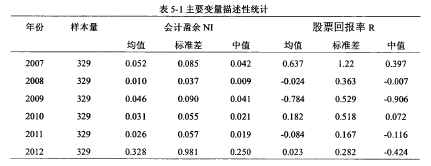 主要變量分年度的描述性統(tǒng)計如表5-1所示,可以看出:(1)會計盈余各年的巾值均小于均值,表示NI是右偏的;(2)股票回報率各年的中值也是小于均值的,表示股票回報率也是右偏;(3)同一年度來看,2007年會計盈余的標準差0.085小于股票回報率的標準差1.22; 2008年會計盈余的標準差0.037小于股票冋報率的標準差0.363;2009年會計盈余的標準差0.090小于股票回報率的標準差0.529; 2010年會計盈余的標準差0.055小于股票回報率的標準差0.518; 2011年會計盈余的標準差0.057小于股票回報率的標準差0.167;只有2012年會計盈余的標準差0.918小于股票回報率的標準差0.282:說明相對丁?會計盈余來說,股票回報率的波動性更大。圖5-1顯示了會計盈余和股票收益率2007-2012年度趨勢圖。圖中顯示,股票收益率有較大波動2007年為最高點為0.637,然后一路下滑,跌至2009年的谷底-0.784后開始回升,但一直處于波動狀態(tài)。上市公司會計盈余較為穩(wěn)定,2007-2011年比較平穩(wěn),2012年升至趨勢由2011年的0.026升至2012年的0.328。