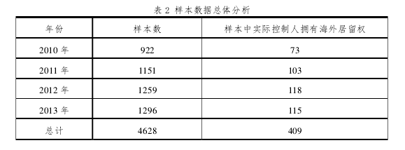 本文研究的目的在于研究上市民營(yíng)企業(yè)家擁有海外居留權(quán)對(duì)公司價(jià)值的影響及其影響機(jī)理。論文選取的研究樣本為 2010 年、2011 年、2012 年、2013 年的民營(yíng)上市公司。 在樣本初期,文章收集了 2010-2013 年 4 年的上市公司的數(shù)據(jù)和信息,并明確文章研究對(duì)象主要針對(duì)民營(yíng)企業(yè)實(shí)際控制人在國(guó)內(nèi)創(chuàng)業(yè)并且企業(yè)在國(guó)內(nèi)上市之后擁有海外居留權(quán)這一情況對(duì)公司價(jià)值的影響?;诖?,①在基礎(chǔ)數(shù)據(jù)庫(kù)中首先篩選刪除非民營(yíng)企業(yè),在非民營(yíng)企業(yè)之中,可以預(yù)見的是大部分為國(guó)有企業(yè),其中不乏中央企業(yè),國(guó)資委和地方國(guó)資委控制的企業(yè)以及中央部門地方部門控制的企業(yè)。②在第一步驟的基礎(chǔ)上進(jìn)一步篩選,刪除的重點(diǎn)為中國(guó)部分大學(xué)控股的企業(yè)以及實(shí)際控制人為集團(tuán)公司的上市企業(yè),集團(tuán)公司為實(shí)際控制人的上市企業(yè)無(wú)法得知其真正的實(shí)際控制人信息,同時(shí)將實(shí)際控制人不存在的企業(yè)也刪除。③在第二步的基礎(chǔ)上,篩選刪除國(guó)外華僑以及國(guó)外集團(tuán)公司、國(guó)外友人在中國(guó)大陸上市的企業(yè),這部分人群的動(dòng)機(jī)與文章要研究的民營(yíng)企業(yè)家移民群體的動(dòng)機(jī)有所區(qū)別,這部分人群大多看好國(guó)內(nèi)投資環(huán)境然后在國(guó)內(nèi)投資創(chuàng)業(yè)并上市,其中尤以來自港澳臺(tái)地區(qū)的實(shí)際控制人為多。④在剩下的擁有海外居留權(quán)的上市公司樣本中主要為國(guó)內(nèi)創(chuàng)業(yè)并且企業(yè)在國(guó)內(nèi)上市的企業(yè),為了區(qū)分動(dòng)機(jī)進(jìn)一步篩選刪除是否在國(guó)外留過學(xué),并且將在國(guó)外留學(xué)的實(shí)際控制人樣本刪除。⑤對(duì)個(gè)別樣本進(jìn)行判斷并篩選刪除或者保留。在前面四步的篩選工作之后具體的研究樣本見表 2。