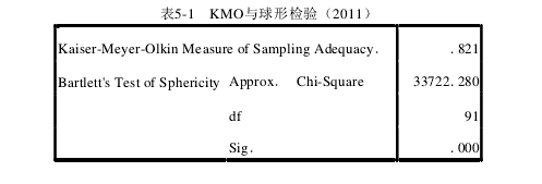 為消除所選 14 個衡量財務(wù)價值的指標(biāo)所包含的信息具有相關(guān)性的影響,在進(jìn)行回歸分析前,對 14 個指標(biāo)進(jìn)行了因子分析。下文以 2011 年為例簡述因子分析過程,2012、2013、2014 年數(shù)據(jù)分析相關(guān)表格見附錄。 第一,通過 KMO  檢驗(yàn)和  Bartlett’s  假設(shè)檢驗(yàn),這一過程是為了驗(yàn)證所選指標(biāo)是否適合做因子分析。表 5-1 為 2011 年財務(wù)指標(biāo)的檢驗(yàn)結(jié)果,KMO 數(shù)值為 0.821,適合做因子分析。本文 2011—2014 年 KMO 數(shù)值分別 0.821、0.592、0.686、0.726,表示本文所構(gòu)建的指標(biāo)體系適合做因子分析。第二,用主成分分析法提取主要因子,表 5-2 顯示了 2011 年各因子的方差貢獻(xiàn)率和累計方差貢獻(xiàn)率。以 2011 年為例,根據(jù)提取特征根大于 1 的方法,前五個因子的累計方差貢獻(xiàn)率達(dá)到 81.55%,說明前五個因子已經(jīng)可以解釋上述 14 個指標(biāo)中的絕大部分信息。但是綜合衡量 2011—2014 的數(shù)據(jù)提取因子的情況,為了保持一致性,我們最終確定選擇 8 個主因子。這 8 個主因子對原有 14 個指標(biāo)的累計方差貢獻(xiàn)率分別達(dá)到了 98.502%、82.297%、89.103%、87.476%,表示所提取的主因子能夠解釋原有 14 個指標(biāo)中絕大部分的信息。因此,可以把它們作為評價上市公司財務(wù)績效的主要評價指標(biāo),分別表示為 F1、F2、F3、F4、F5、F6、F7、F8。