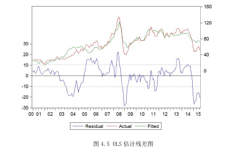 被解釋變量采用國(guó)際原油價(jià)格采用 WTI 期貨原油,目前國(guó)際原油市場(chǎng)上參考的基準(zhǔn)價(jià)格主要有三個(gè):一是紐約商品交易所(NYMEX)交易的西得克薩斯中質(zhì)原油(WTI)期貨合約,是在 1983 年推出的,是北美地區(qū)主要參考基準(zhǔn)價(jià)格;二是北海布倫特原油(Brent),由倫敦國(guó)際石油交易所(IPE)推出,其品質(zhì)要低于 WTI 原油合約交割質(zhì)量品級(jí),是歐洲、非洲和中東地區(qū)主要參考基準(zhǔn)價(jià)格;中東地區(qū)的基準(zhǔn)原油是迪拜原油,也是中東地區(qū)向亞太地區(qū)出口原油的參考基準(zhǔn)。中東原油以高硫原油為主,本身質(zhì)量差異較大,品種間價(jià)差也不平穩(wěn),同時(shí)缺乏權(quán)威市場(chǎng)交易形成的基準(zhǔn)價(jià),在此不做考慮。本文采用 WTI 原油期貨價(jià)格作為基礎(chǔ)數(shù)據(jù)和預(yù)測(cè)對(duì)象,選擇 2000 年 12 月至 2015 年 7 月的 WTI 原油期貨連續(xù)月度均價(jià)共 176 個(gè)數(shù)據(jù)的前 156 個(gè)數(shù)據(jù)進(jìn)行建模,后 20 個(gè)數(shù)據(jù)用于樣本外預(yù)測(cè)。數(shù)據(jù)來(lái)源于 Wind 資訊。解釋變量方面,基于第二章關(guān)于國(guó)際原油價(jià)格影響因素的定性分析,同時(shí)兼顧月度數(shù)據(jù)易得性,供給因素方面將 OPEC 原油與美原油產(chǎn)量進(jìn)行按月加總,兩者之和能夠更好反映主要石油生產(chǎn)國(guó)的供應(yīng)變化,該數(shù)據(jù)來(lái)源于 EIA(EnergyInformation Administration);從需求因素方面選取替代能源煤炭?jī)r(jià)格作為解釋變量,以反映兩者的替代效應(yīng),具體數(shù)據(jù)采用具有代表性的澳大利亞 BJ 動(dòng)力煤月度均價(jià);從庫(kù)存方面選取美國(guó)原油庫(kù)存(包括戰(zhàn)略石油儲(chǔ)備)月度均值,該數(shù)據(jù)來(lái)源于 EIA;美元匯率方面采用眾所周知的美元指數(shù)(USDX)月度均值;投機(jī)行為方面,采用 WTI 原油非商業(yè)凈多頭持倉(cāng)數(shù)量(單位:萬(wàn)張),即非商業(yè)多頭持倉(cāng)數(shù)量與非商業(yè)凈空頭寸持倉(cāng)數(shù)量之差。該數(shù)據(jù)來(lái)源于美國(guó)商品期貨交易委員會(huì)。