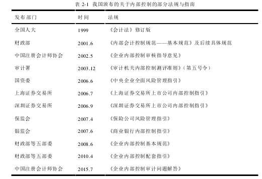 我國企業(yè)的內(nèi)部控制長期以來一直處于“諸侯割據(jù)”的狀態(tài),很多部門都積極參與了企業(yè)內(nèi)部控制制度的建設(shè)工作,先后頒布了許多關(guān)于內(nèi)部控制的法律、法規(guī)(具體見表2-1)。我國企業(yè)內(nèi)部控制的發(fā)展大體可以分為兩個階段:第一個階段為學習和探索階段(1949-2005),第二個階段為發(fā)展與創(chuàng)新階段(2006-至今)。 在學習與探索階段,從內(nèi)部控制的內(nèi)涵與目標來看,主要有以下特點,其一《會計法》對內(nèi)部控制有一定的約束力,但僅限于會計控制層面,并未形成一個內(nèi)部控制體系框架的概念;其二內(nèi)部控制的內(nèi)涵和目標具有明顯的行業(yè)特色,都是針對特定行業(yè)的企業(yè)設(shè)定的,從整體上看,缺乏一個統(tǒng)一的、權(quán)威的、綜合的內(nèi)部控制概念體系;三是內(nèi)部控制的定位參差不齊,有的是會計控制,有的是內(nèi)部控制,有的是風險控制,總體上定位比較低,也沒有形成一個大家都認可和接受的定位;其四是關(guān)于內(nèi)部控制的內(nèi)涵和目標,借鑒了 COSO內(nèi)部控制框架,同時結(jié)合了本行業(yè)特色。 內(nèi)部控制的原則方面,這一階段確定了內(nèi)部控制的一些原則性問題,并已形成框架體系的重要組成部分。我國對內(nèi)部控制的基本原則雖然各自已經(jīng)形成了一些體系,也達成了一些共識,但各部門的法規(guī)之間以及同一部門的前后法規(guī)之間還存在不一致、不協(xié)調(diào)的地方,還具有一定的行業(yè)特點。 從內(nèi)部控制的內(nèi)容與結(jié)構(gòu)來看,主要有以下特點,一是內(nèi)部控制的內(nèi)容范圍日漸豐富,不僅包括會計控制,也涉及到風險管理和管理控制,最大的特色就是行業(yè)特征明顯;二是中國的內(nèi)部控制結(jié)構(gòu)不盡相同,大體分為實務(wù)型、框架結(jié)構(gòu)型和框架與實務(wù)相結(jié)合型,即中國并未形成統(tǒng)一的內(nèi)部控制框架;三是在構(gòu)成要素和結(jié)構(gòu)上,基本上都與 COSO 內(nèi)部控制框架的結(jié)構(gòu)和要素類似,但具體內(nèi)容又存在一些差別。