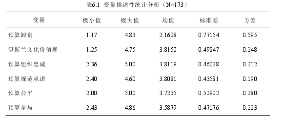 從 6.1 統(tǒng)計(jì)結(jié)果來(lái)看,預(yù)算組織忠誠(chéng)和預(yù)算規(guī)范承諾的均值較高,分別為 3.8119 和3.8081,伊斯蘭文化價(jià)值觀的均值最高,為 3.8150,說(shuō)明新疆地區(qū)多民族企業(yè)中,受伊斯蘭文化價(jià)值觀的影響較大;預(yù)算機(jī)會(huì)主義的后果預(yù)算卸責(zé)的均值最低,為 2.1628,說(shuō)