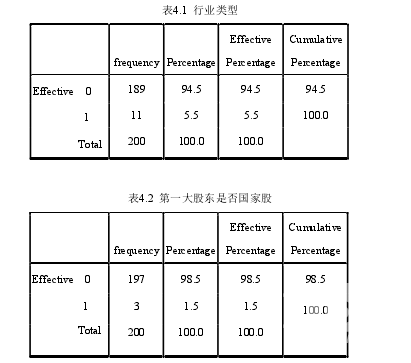 本文使用 SPSS statistics17.0 對所抽樣的 200 家上市公司進(jìn)行描述性統(tǒng)計(jì)分析,由于行業(yè)類型、第一大股東屬性和兩職合一是虛擬變量所以單獨(dú)統(tǒng)計(jì)如表 4.1、4.2、4.3 所示。在樣本公司中,屬于壟斷行業(yè)的上市公司有 11 家,占所選樣本公司的 5.5%,這些公司在披露信息時(shí),自愿性披露的程度不高;第一大股東是國有股屬性的有 3家公司,在所選樣本中占 1.5%,本文預(yù)測國有股屬性的公司沒有多大動力去進(jìn)行自愿披露;其中董事長和 CEO 同屬一人的情況有 52 例,這種現(xiàn)象占到所選樣本的大約 25%以上,同時(shí)在樣本搜集的過程中還發(fā)現(xiàn)公司的 CEO 由副董事長擔(dān)任,這同樣會削弱董事會的監(jiān)督功能,阻礙其自愿披露信息的行為。所選的200家樣本公司中,自愿性信息披露程度得分最低的為14分,經(jīng)查詢這家公司為沈陽化工(000698),因?yàn)槠鋸氖孪∪蹦茉捶矫娴膲艛嘈袠I(yè),故其進(jìn)行自愿披露的程度比較低;最高值為23分,經(jīng)查詢原始數(shù)據(jù)資料,知道這家公司為美的集團(tuán)(000333),屬于電氣機(jī)械和器材制造業(yè),其自愿性披露程度相對較高。本文將所選樣本按照自己構(gòu)建的因變量評價(jià)體系進(jìn)行評分,統(tǒng)計(jì)結(jié)果發(fā)現(xiàn)樣本的均值為18.19分,標(biāo)準(zhǔn)差為1.472。顯而易見,樣本公司總體的自愿披露信息的水平很低,并且披露的內(nèi)容集中在幾個(gè)項(xiàng)目中間。