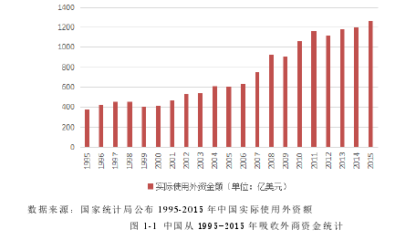 自從加入 WTO 后,中國的經(jīng)濟進入快速發(fā)展的階段。隨著中國經(jīng)濟進入調整階段,充分發(fā)揮民間資本與外來資本的作用已成為經(jīng)濟體制改革的一個重要方式[1,2]。2012 年,中國吸引外資額全球第一。但外資持有公司股份的比例依然很低。因此,將來會有越來越多的外資以持股的方式進入中國。一方面,外國投資者投資中國股市多以價值投資為理念,為上市公司提供更好的經(jīng)營理念、管理技術、人力資本并更好的監(jiān)督公司運行;另一方面,由于外國投資者獲得國際信息渠道比國內投資者多,外國投資者對宏觀經(jīng)濟變化敏感,外國投資者的逐利性致使外資資金的頻繁流動。外資股權的這種雙重性對上市公司產(chǎn)生的影響成為中國資本市場開放過程中必須回答的問題。 1978 年以來,我國開始實行改革開放,中國的經(jīng)濟發(fā)展已進入了一個快速發(fā)展的新階段。吸引了大量境外資金往國內的流入。據(jù)國家統(tǒng)計局所發(fā)布的統(tǒng)計數(shù)據(jù),2015 年中國實際使用外資額為 7813.5 億元人民幣,外資對中國經(jīng)濟的發(fā)展起到了舉足輕重的作用。從上圖 1-1 中我們可以看到中國從 1995 年到 2015 年每年吸收外商直接投資的發(fā)展趨勢。中國吸收外商投資受國際經(jīng)濟環(huán)境的影響,并不是逐年增加的,但總體趨勢是逐步增長。2015 年中國外商投資額比 1995 年的 3 倍還要多。自改革開放以來,中國的經(jīng)濟得到了長足的進步和發(fā)展,同時隨著中國經(jīng)濟政策的改變,中國經(jīng)濟市場對外開放也會得到進一步提升,因此會促進國外資金向中國經(jīng)濟市場的流動。 隨著中國對外資股權政策的進一步寬松,未來外資越來越多地會以股權投資的方式投資公司。2002 年 6 月,在國際證監(jiān)會組織年會上,中國證監(jiān)會主席周小川提出了 QFII 的概念。之后引進合格境外機構投資者論壇在深圳成功舉辦。自 2003 年以來,中國首次批準境外機構投資者投資中國股市,境外機構投資者獲批數(shù)量及投資額度增長速度飛速發(fā)展。在 2014 年底,獲得進入中國市場的境外投資機構的數(shù)量達到 274 家,與剛開始實行 QFII 制度時的境外投資者數(shù)量相比增長了 22 倍。而 2014 年獲批 669.23 億美元的投資額度與2003 年獲批的 17 億美元的投資額度相比,更是增長了 39 倍多。同時,外國投資者的類型也不再單一,變得多樣化。同時,隨著外資的增多,中國經(jīng)濟受境外投資的影響也逐漸增大。